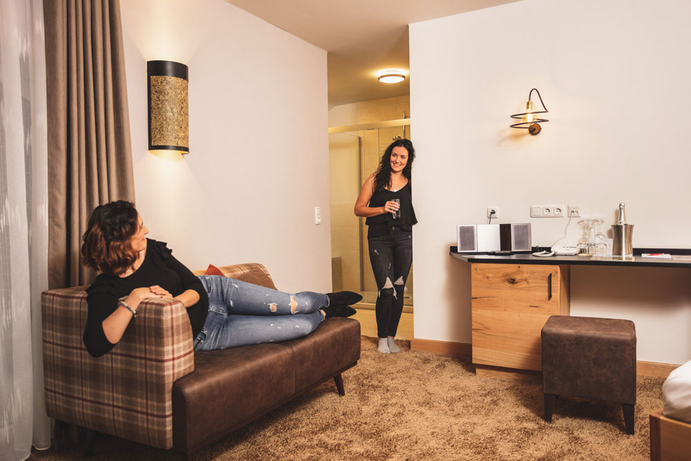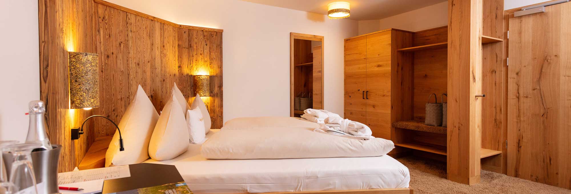 Einrichtung in gehackter Wildeiche.Die Holzvertäfelungen verleihen den Suiten einen gemütlichen Charme.